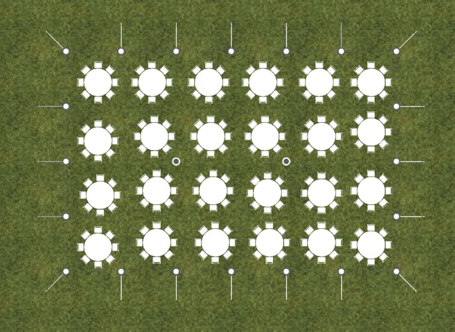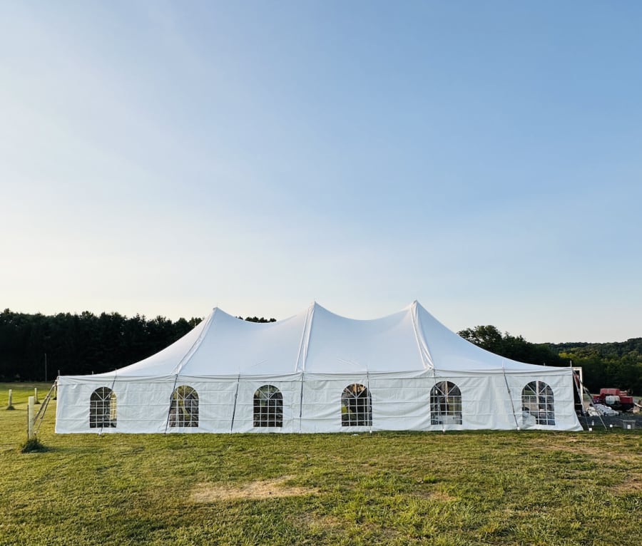 Our 40x60 High Peak Pole Tent is ideal if you will be planning a larger event. You can host an event for up to 240 guests with rectangular tables or 192 guests with 60" round tables.
