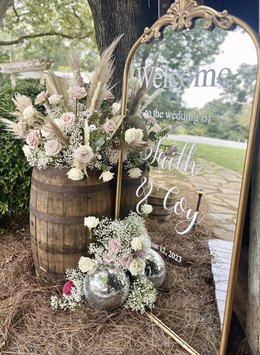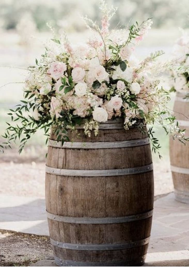 The possibilities are endless with our perfect antique wine barrels which would add a great touch of country, rustic personality. You can use the wine barrels as entrance decor for an outdoor ceremony, base for table using such as displaying photos & signs or as a floral stand with large, beautiful arrangements.