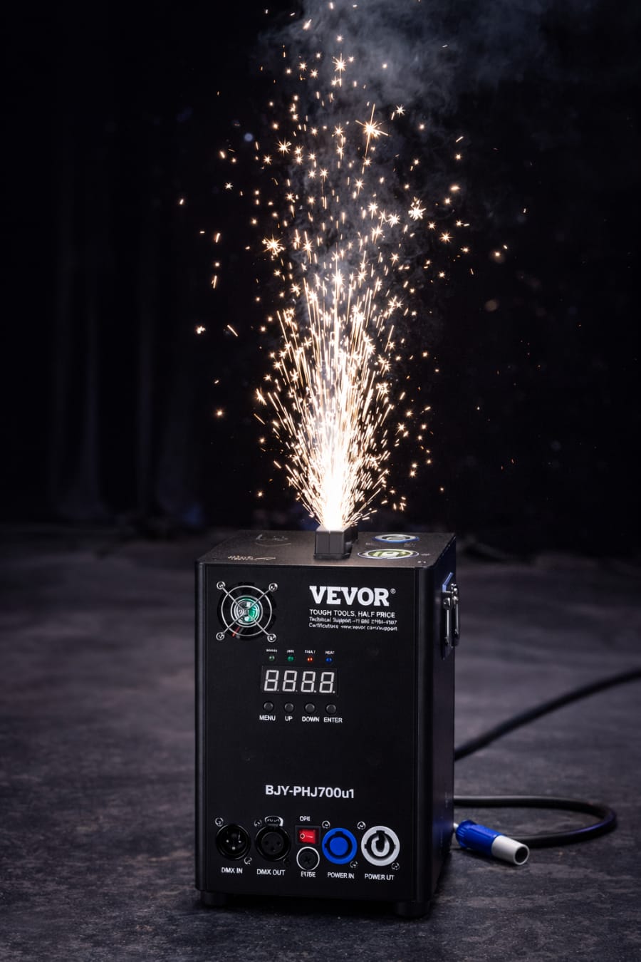 Our 700 watts cold spark machine creates a safe, indoor friendly pyrotechnic-like effects using titanium powder, offering dazzling upward sparks (up to 15 ft high) perfect for weddings, stage shows and parties.