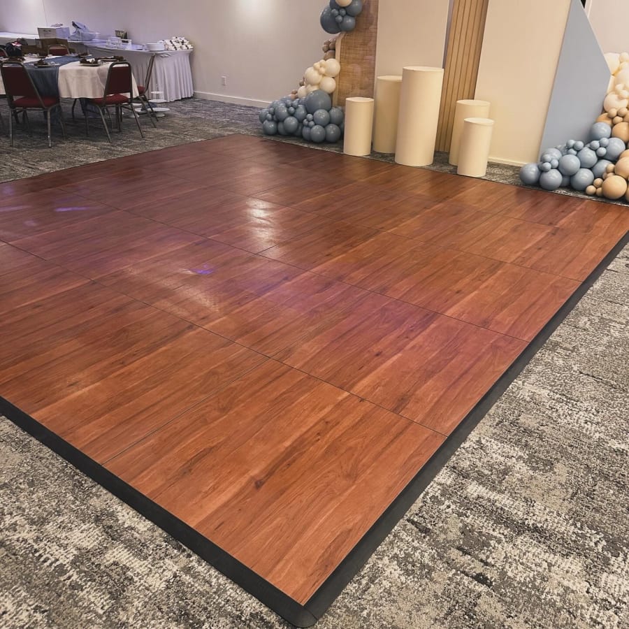 The Dark Maple Dance Floor system combines excellent quality and a neutral appearance perfect for events, parties, residential spaces, and commercial spaces. Dance floor is 100% water resistant and designed for indoor and outdoor use.