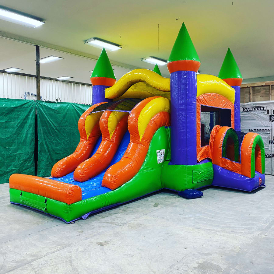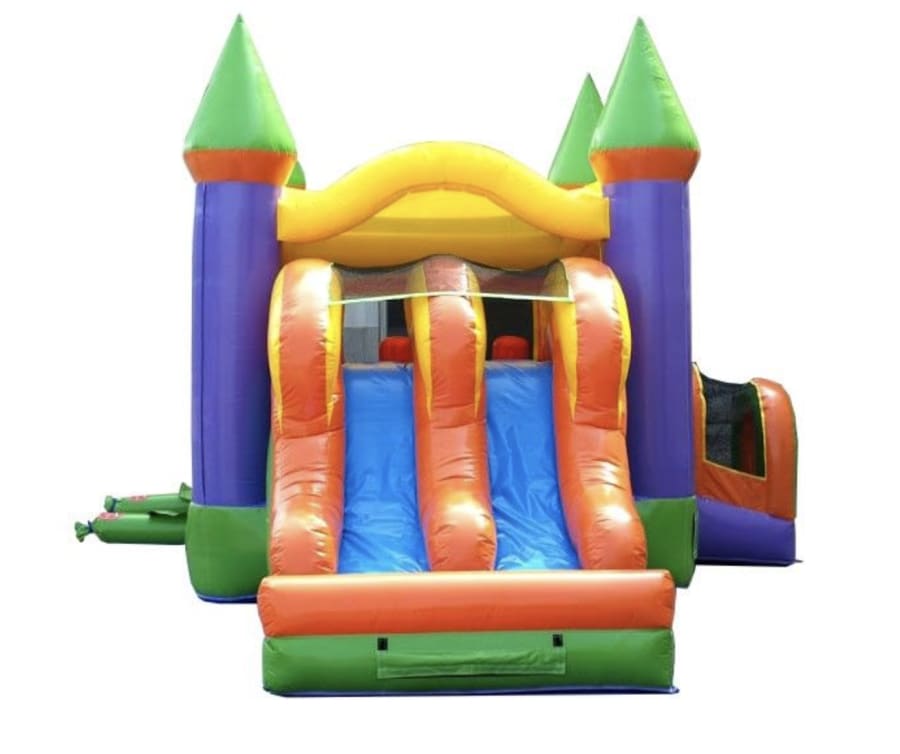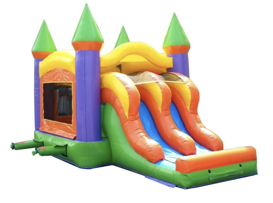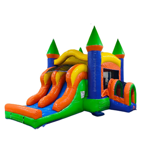 Our Rainbow Dual Lane Combo is the perfect playhouse! With a dual lane slide, bounce house, climb wall, and basketball hoop entertainment is well guaranteed!