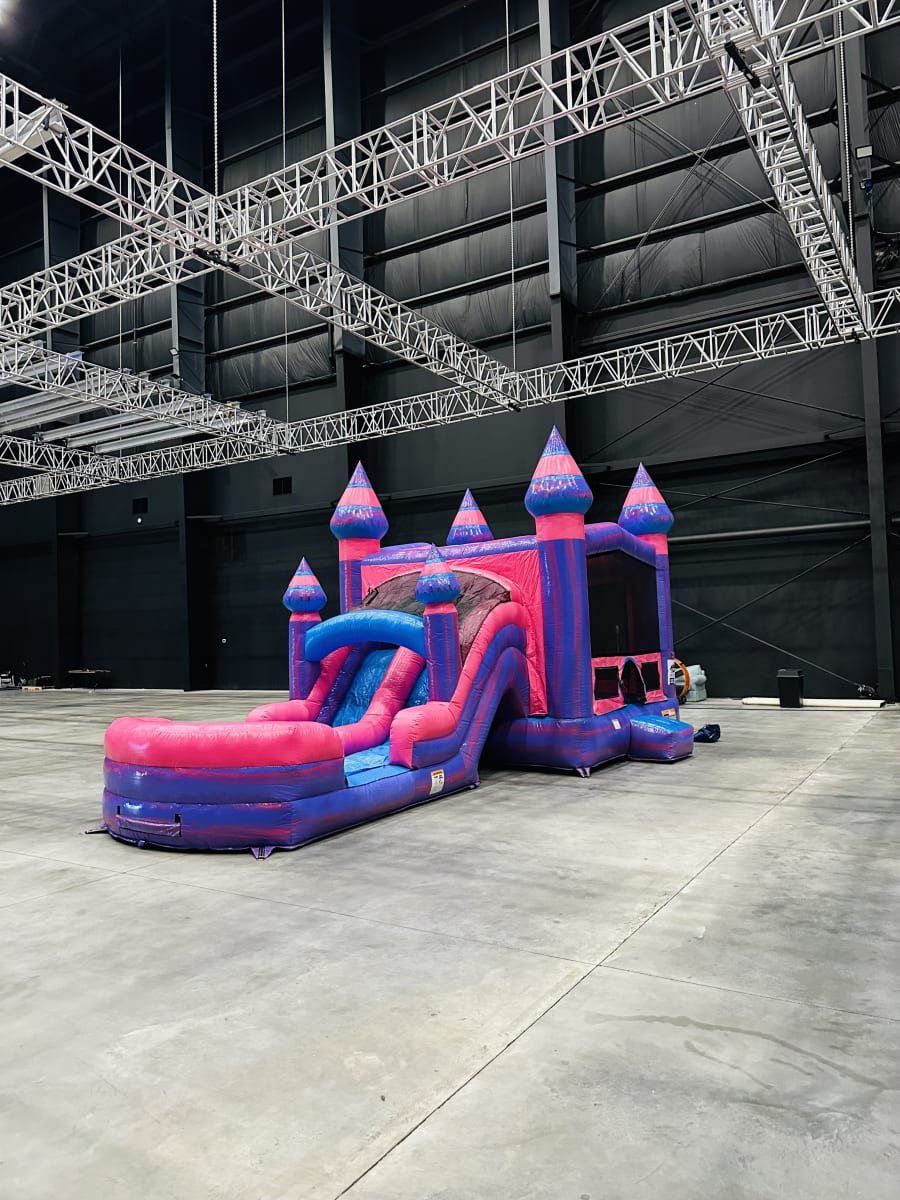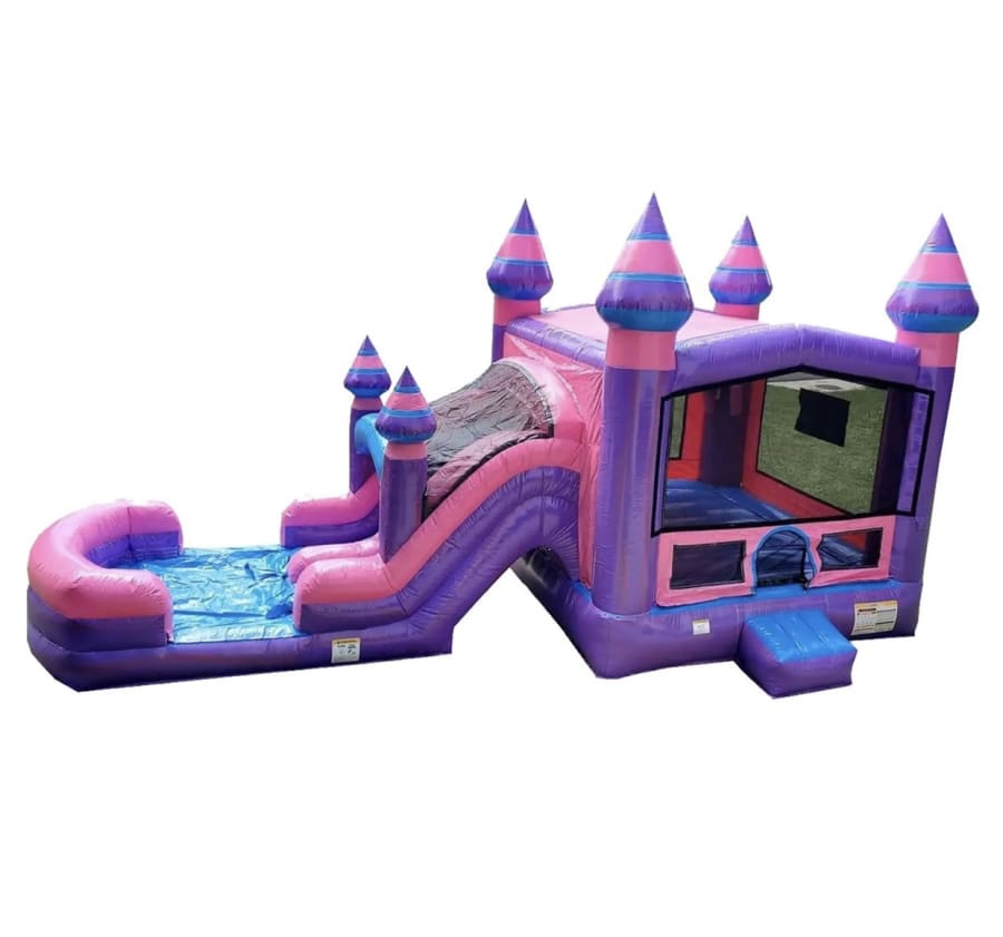 Pretty in pink, our Purplish Dual Lane Combo is the perfect playhouse! With a dual lane slide, bounce house, climb wall, and basketball hoop entertainment is well guaranteed!