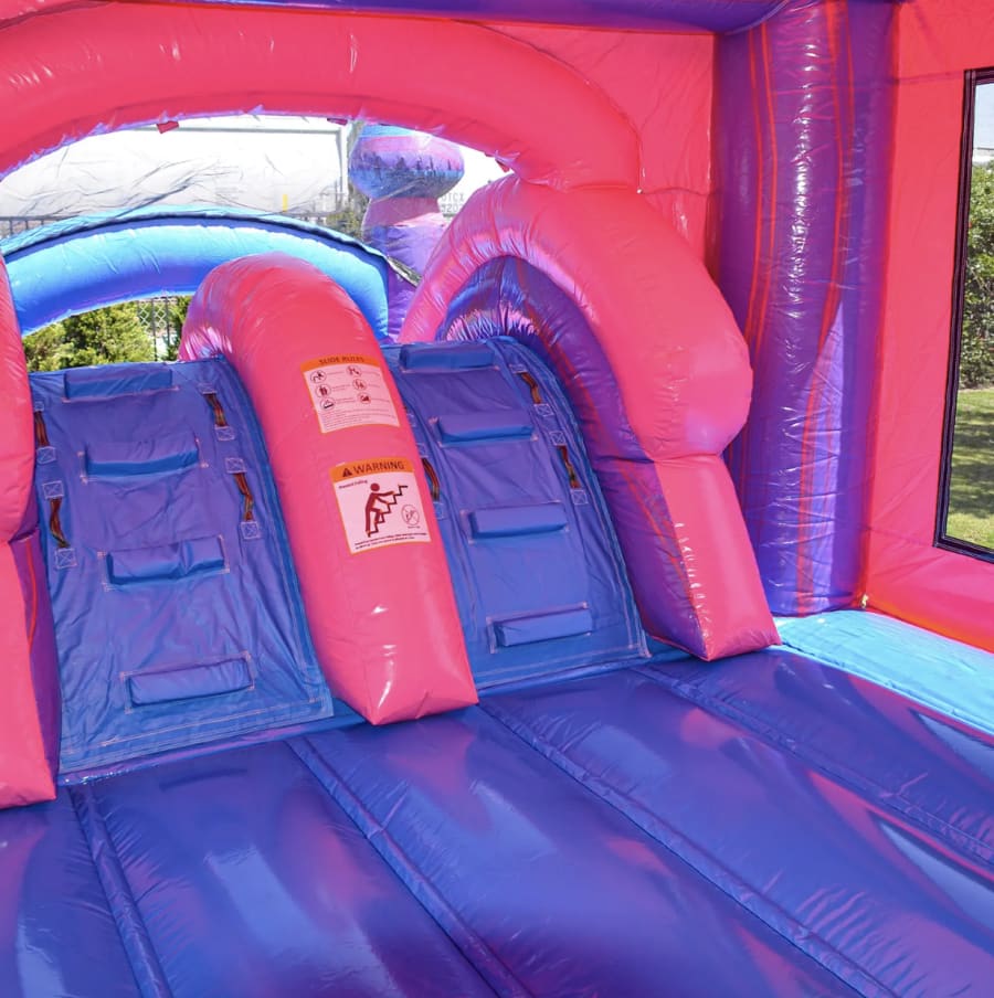 Pretty in pink, our Purplish Dual Lane Combo is the perfect playhouse! With a dual lane slide, bounce house, climb wall, and basketball hoop, just add a hose and it's a splashful of fun in those hot summer days!
