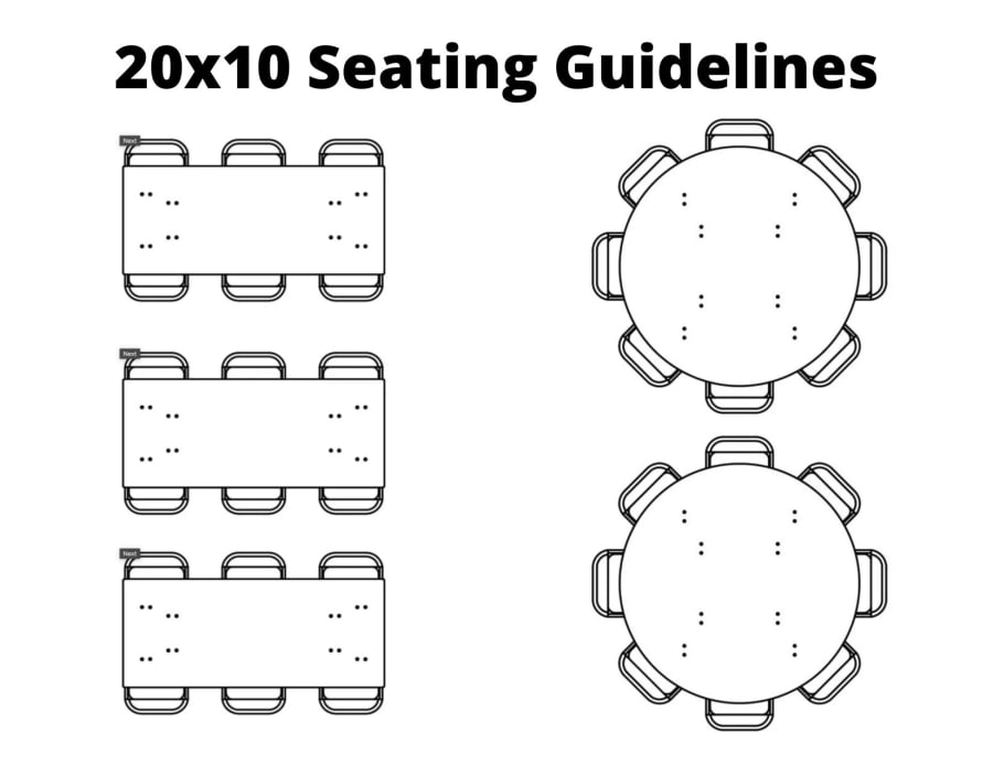 Our 20x10 frame tent is ideal if you will be hosting something small, need some shade from the weather or want extra place for food/beverage setting. You can host an event for 18-20 guests with rectangular tables or 16 guests with 60" round tables.